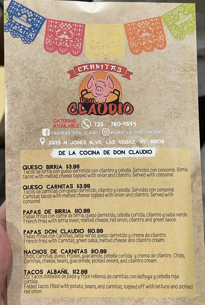 Welcome to Carnitas Don Claudio, a hidden gem nestled in the heart of Las Vegas. This restaurant specializes in authentic Latin flavors, boasting a diverse menu that showcases the star ingredient: carnitas. With a rich array of options, diners can indulge in breakfast plates like Chilaquiles Puercos Rojos o Verdes and Huevos Rancheros, each priced around $16 to $17.99.