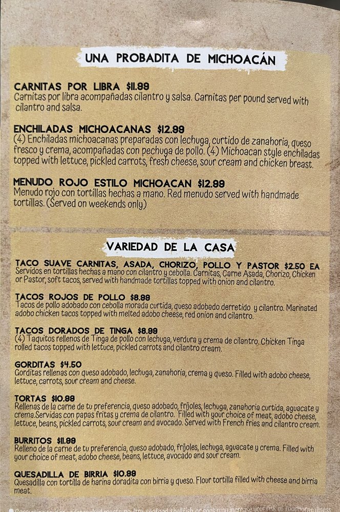 For those craving something substantial, the Carnitas by the Pound section offers a delightful selection, including classics like Carnitas at $14.99 and Buche at $16.99. Don’t miss out on their impressive taco selection, starting at $3.90 each, perfect for a quick bite or a satisfying meal.